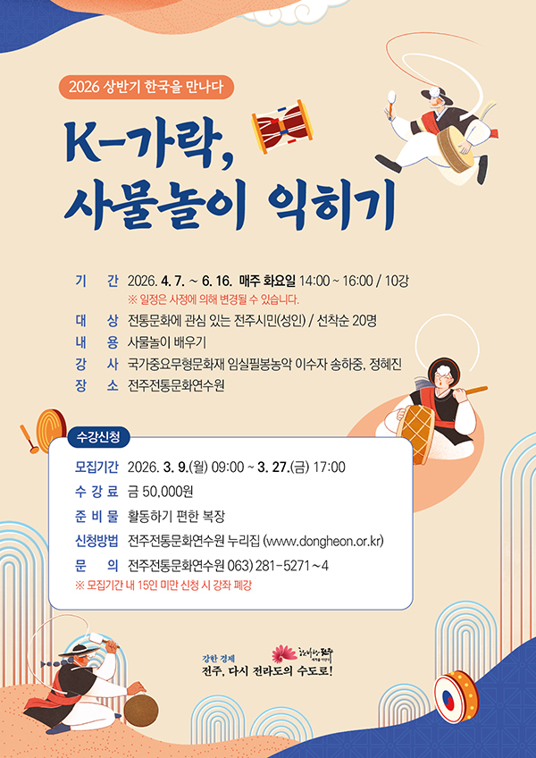 2026년 상반기 한국을 만나다 ‘K-가락, 사물놀이 익히기’ 수강생을 모집합니다. 많은 관심과 참여 바랍니 ..