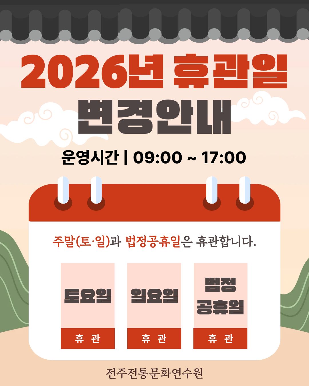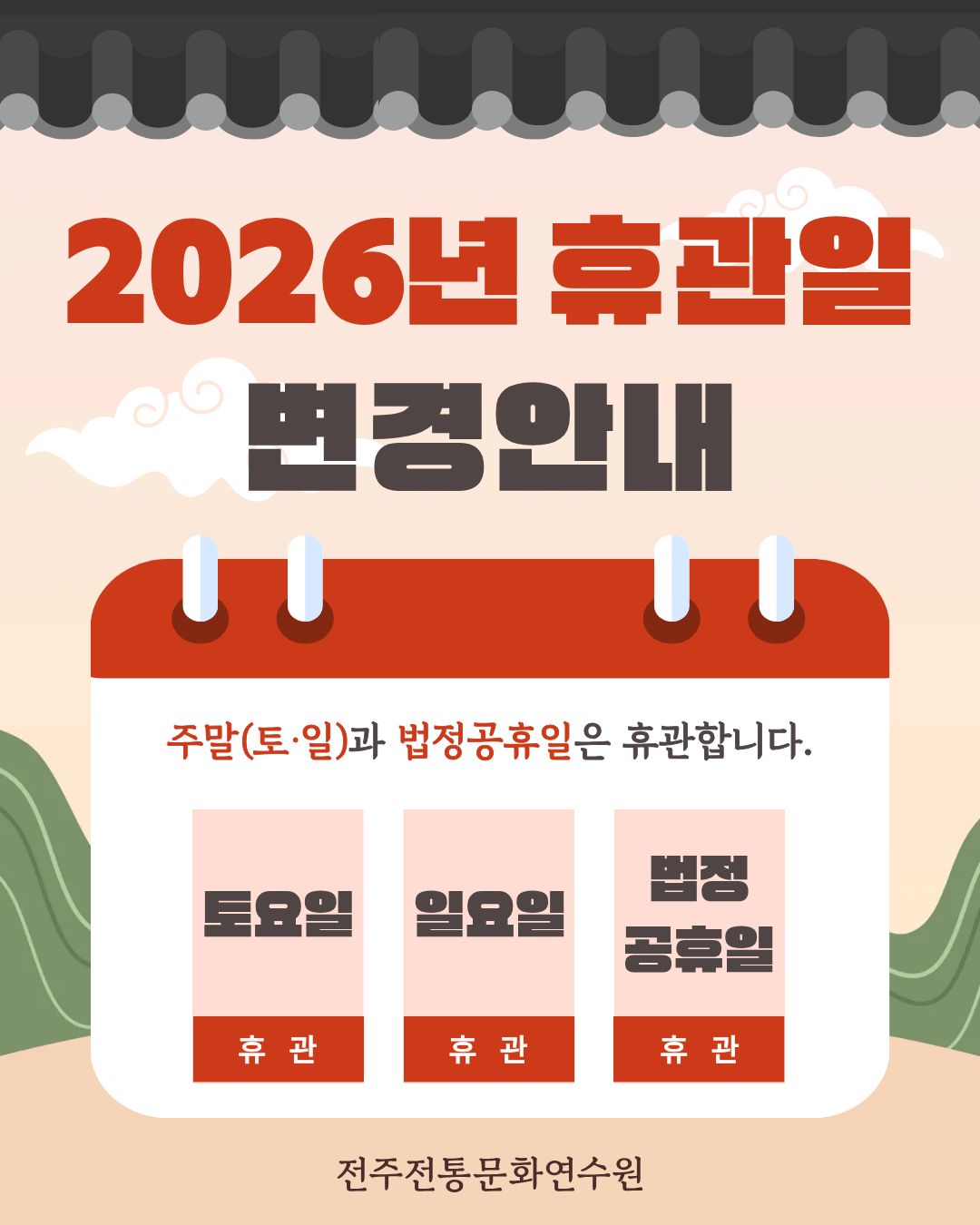 2026년부터 주말(토·일)과 법정공휴일은 휴관합니다. 👉 휴관 일정을 꼭 확인하셔서 방문에 착오 없으시길 ..