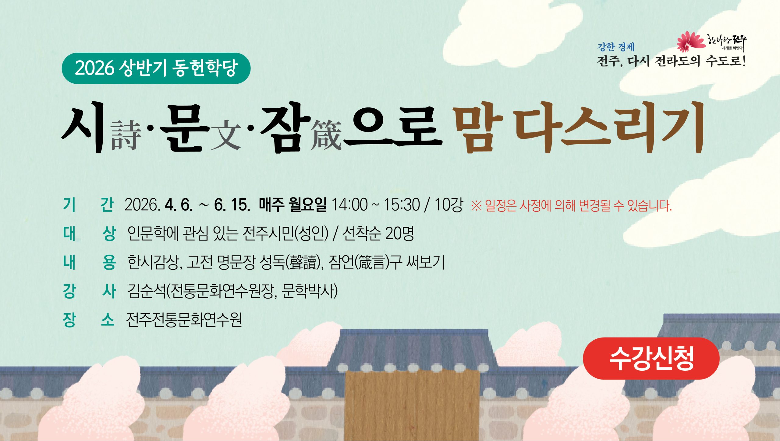 2026년 상반기 동헌학당 ‘시(詩)·문(文)·잠(箴)으로 맘 다스리기’ 수강생을 모집합니다. 많은 관심과 ..
