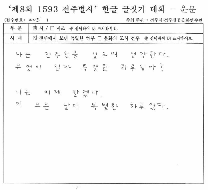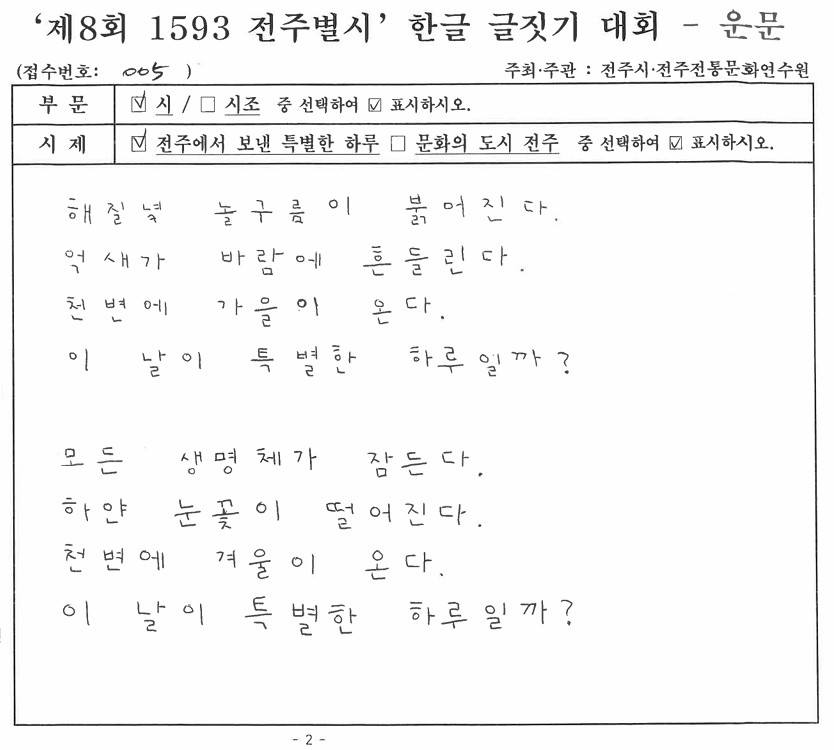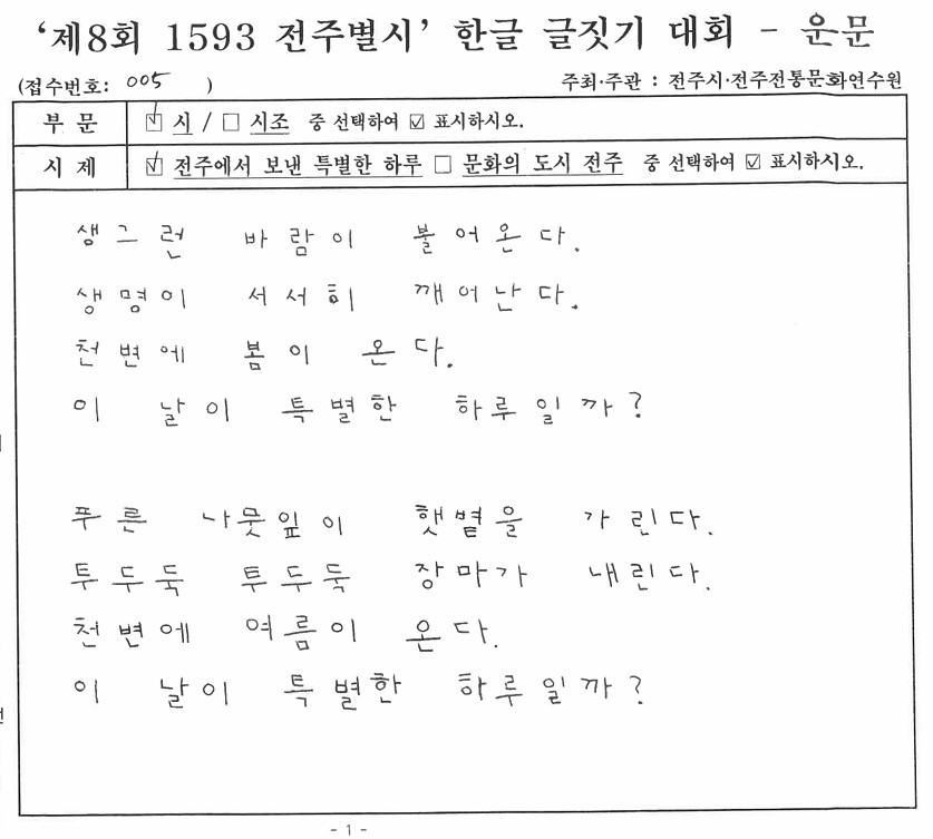 '제8회 1593 전주별시' 한글 글짓기 장원작(운문)