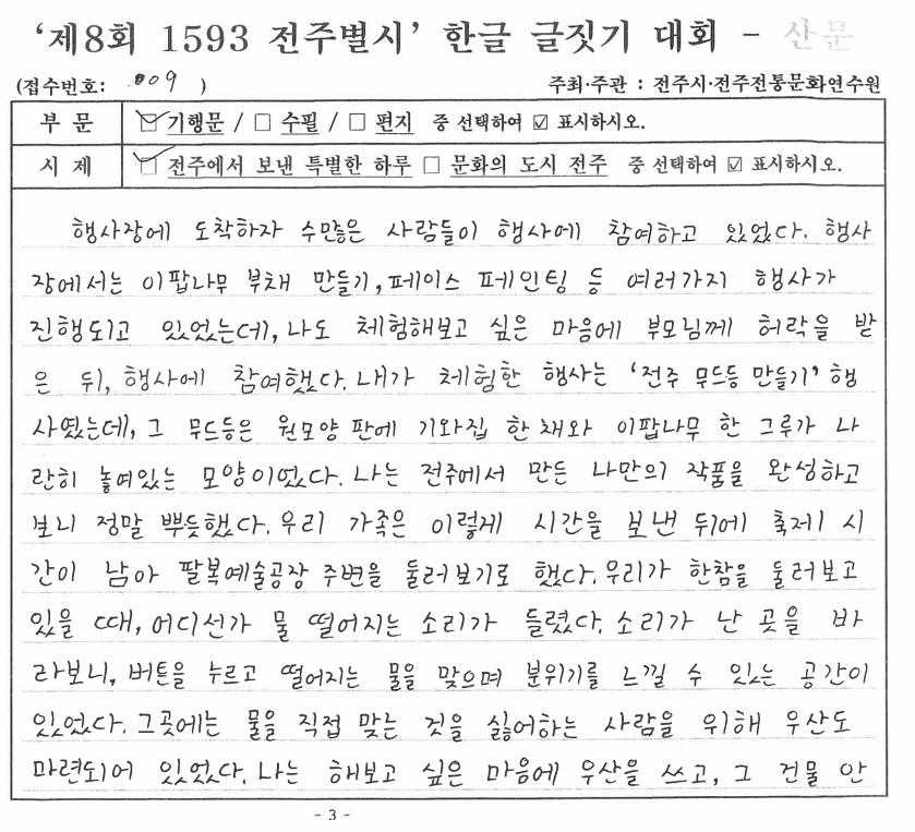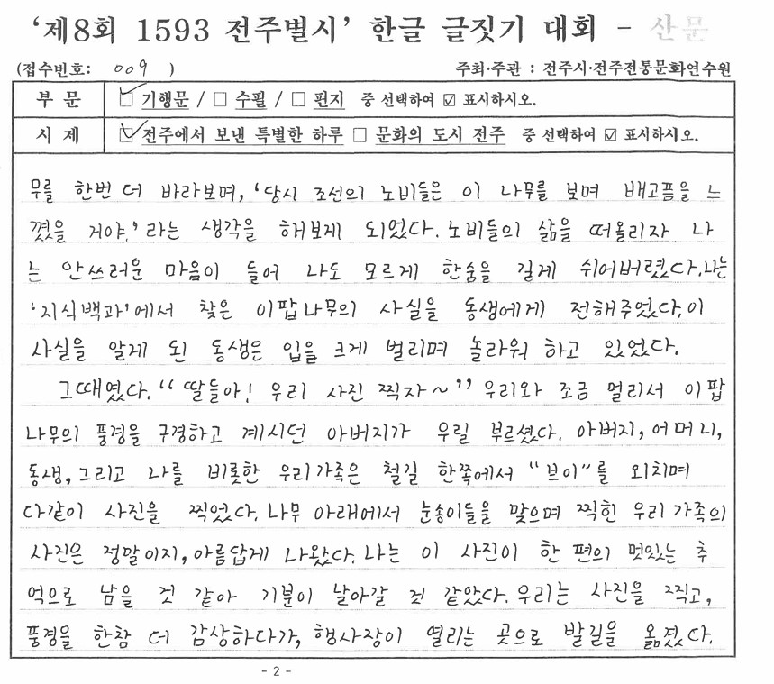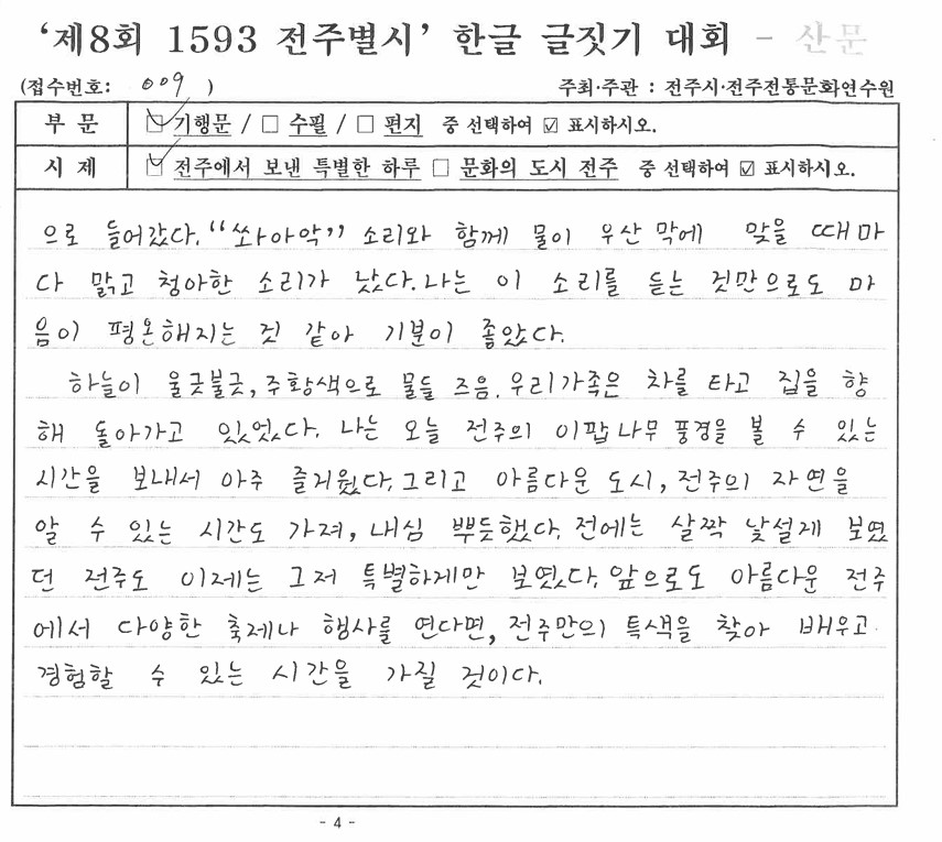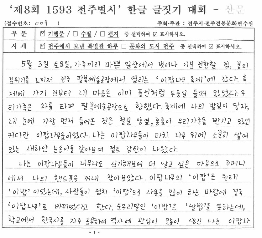 '제8회 1593 전주별시' 한글 글짓기 장원작(산문)